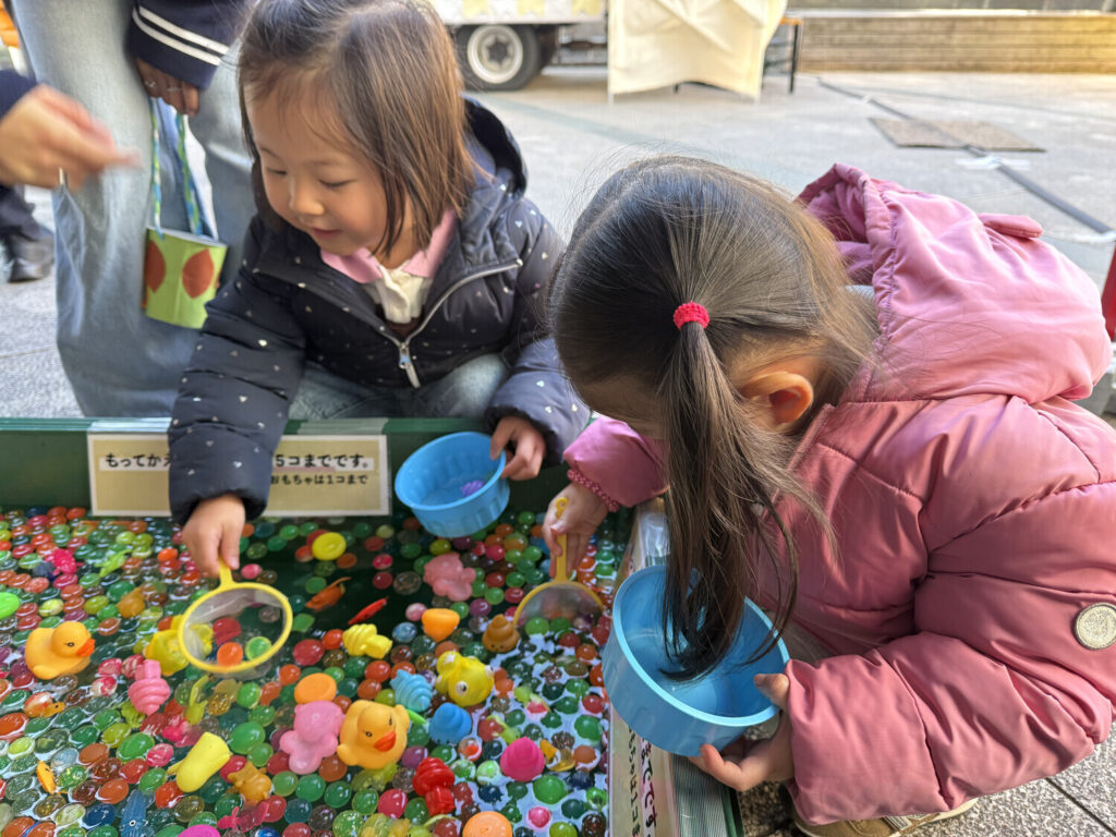 1. おもちゃ掬い (omocha sukui; recogida de juguetes). Consistía en recoger juguetes que estaban flotando en un contenedor con agua, utilizando una pala de papel. La idea es sacar la mayor cantidad de juguetes posible antes de que el papel se rompa por completo. Solo podían quedarse con un máximo de cinco juguetes.