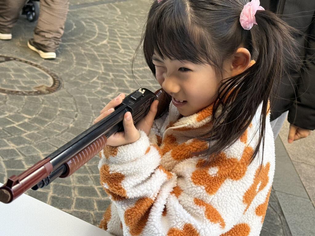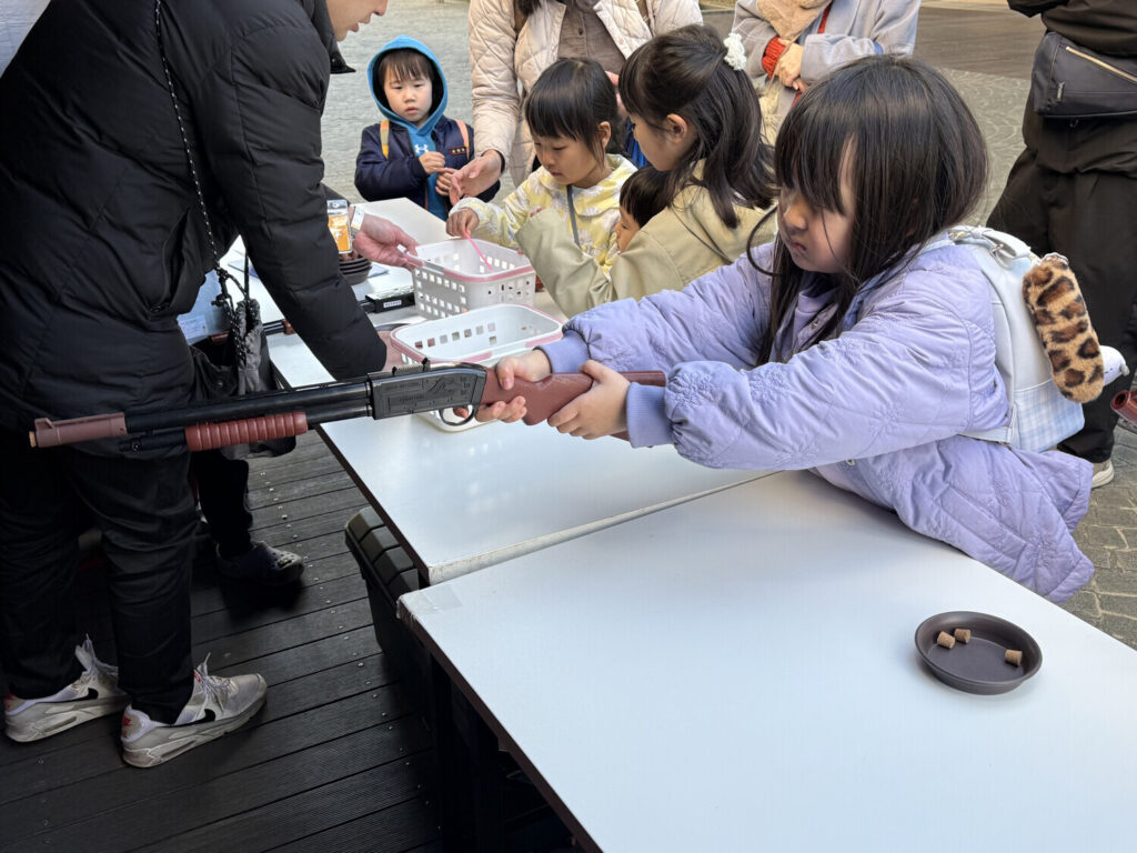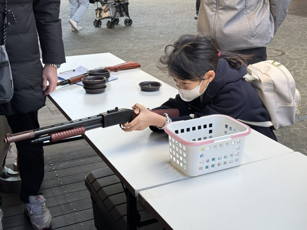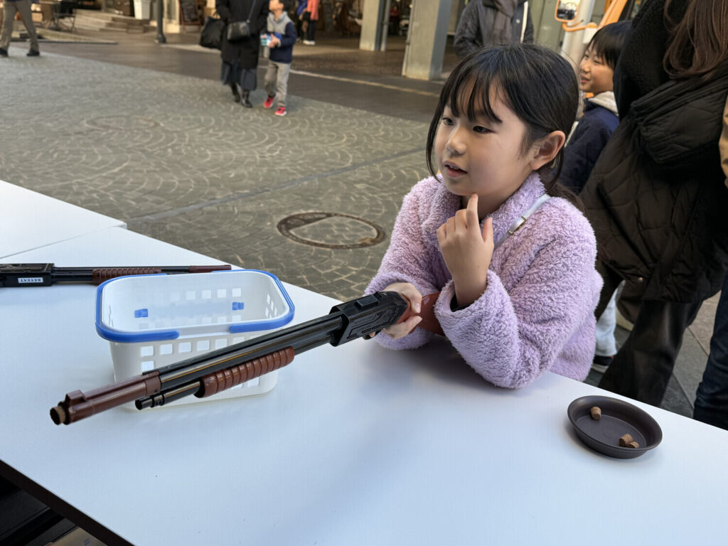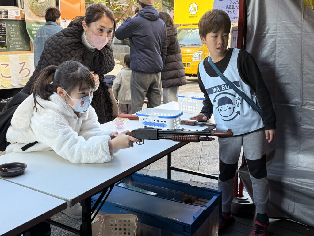 2. 射的 (shateki). Consistía en usar una escopeta de juguete para disparar corchos a premios colocados en estantes. Si logras derribar un objeto, te lo llevas como premio. Cada participante recibía cinco corchos, con lo cual tenía cinco oportunidades de disparo.