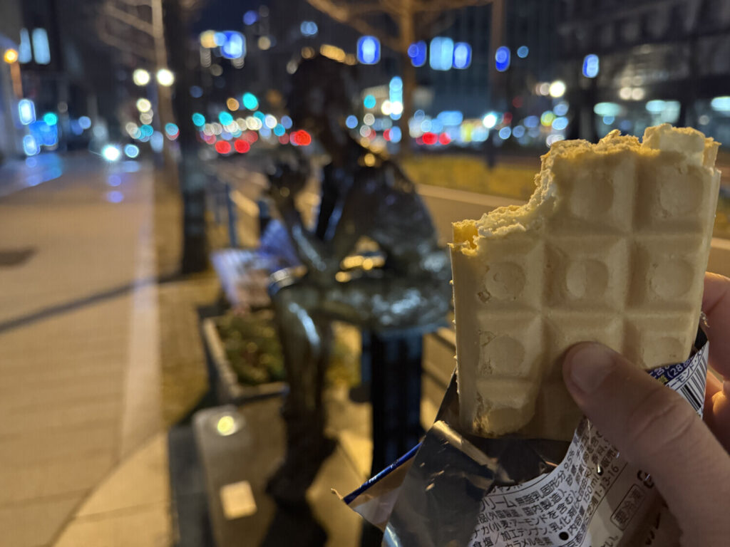 En el camino pasé por un supermercado llamado Kohyo y me compré provisiones (¥1063; ~6€), incluyendo un helado Vanilla Monaka Jumbo, el cual tomé mientras caminaba por la avenida Midosuji.