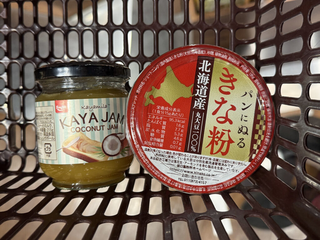 Cuando salí de la reunión me paseé un breve rato por Hirakata Mall, un centro comercial al lado de la estación. Entré a una sola tienda: Kaldi Coffee Farm. Allí me compré una pasta para untar de kaya y otra de kinako (¥996; ~5€).
