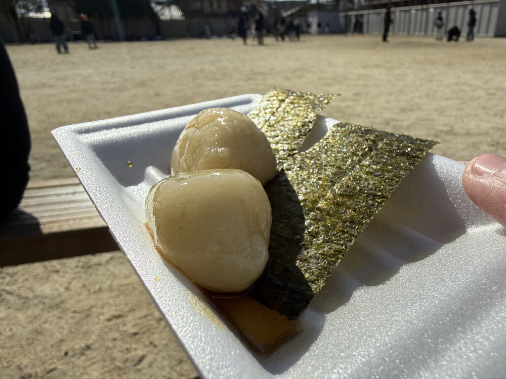 A las 11:00 fui un rato con Lena. Cada mochi costaba 100 yenes y había de dos gustos: kinako y nori. Nos pedimos uno de cada uno cada uno, así que en total gastamos ¥200 (1€).