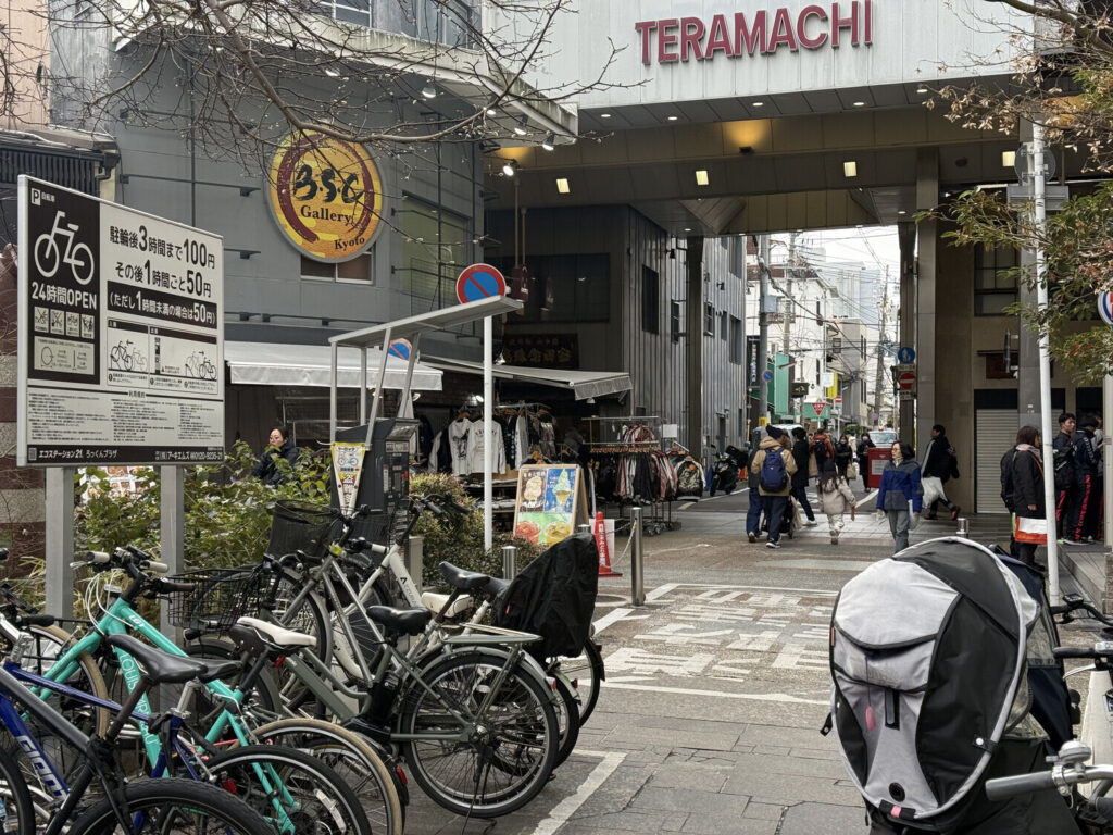 A las 13:00 pasadas salí con la bici y media hora más tarde llegué a la calle comercial de Teramachi. Dejé la bici en un aparcamiento de pago. Las primeras tres horas costaban ¥100, y cada hora adicional costaba ¥50 más. Miré el reloj y me dije que tenía hasta las 16:40 para recorrer la zona a pie.