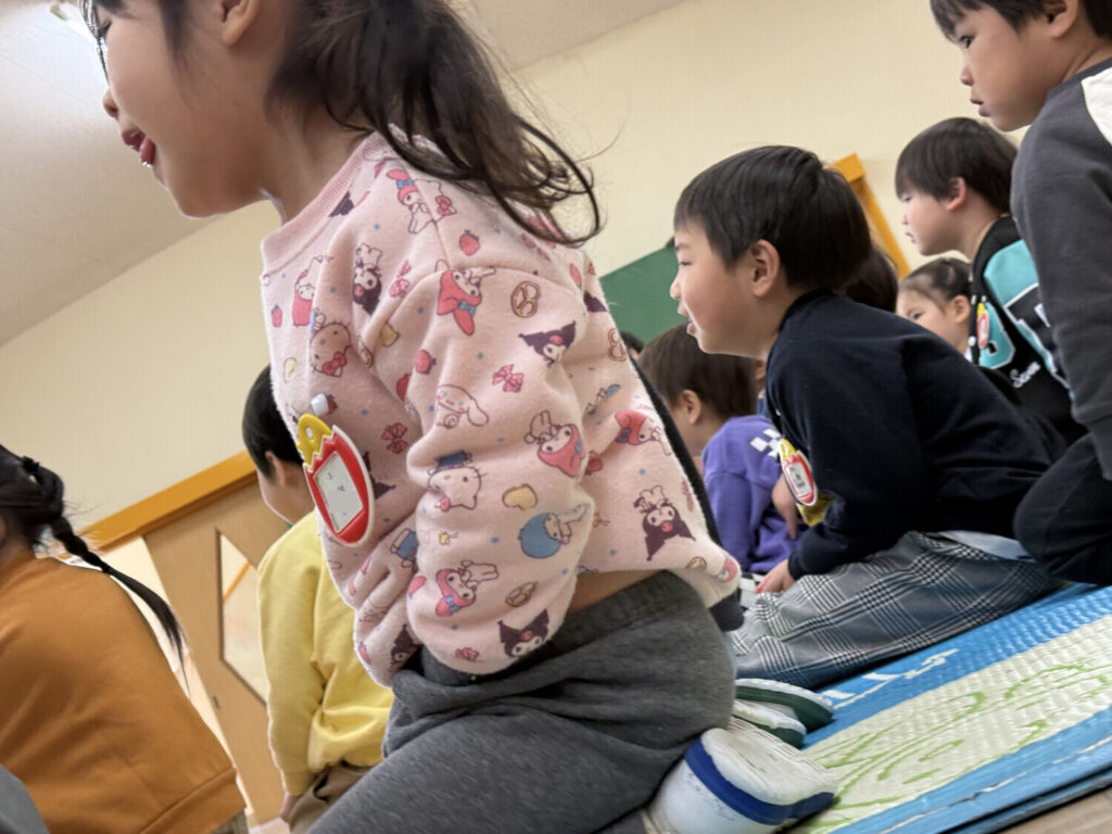 En un momento me crucé con Mika-chan, y me dijo que quería jugar conmigo. Yo le pregunté si no se estaba yendo a su casa y me explicó que no, que ella era de くまっこ (Kumakko), que al parecer es un grupo de niños que se quedan después de clases jugando tanto en los juegos en el interior como en el patio del jardín hasta que sus padres puedan venir a buscarlos. Se trata de un servicio adicional que ofrece el jardín para los padres que no pueden venir a las 14:00 cuando terminan las clases.