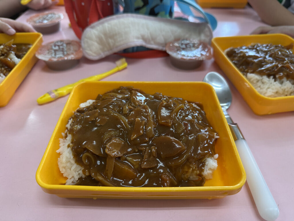 A las 12:00 almorzamos algo especial: arroz con curry. Los padres habían sido notificados en el calendario que hoy los peques tenían que venir con una cuchara y no con palillos.