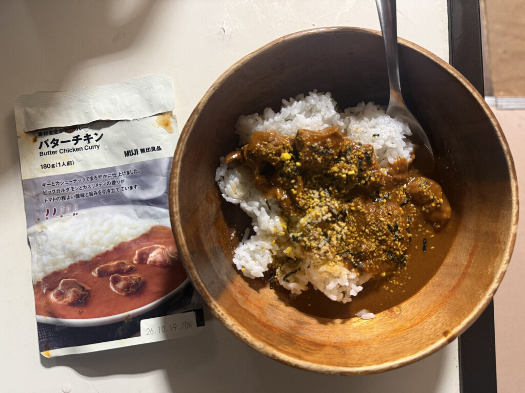 A la noche me volví a preparar una cena fácil gracias a los productos convenientes japoneses. La misma consistió en arroz y butter chicken curry (pollo al curry con mantequilla). Sí, lo sé, muy similar a lo que había comido en el almuerzo pero bueno, se dio así.
