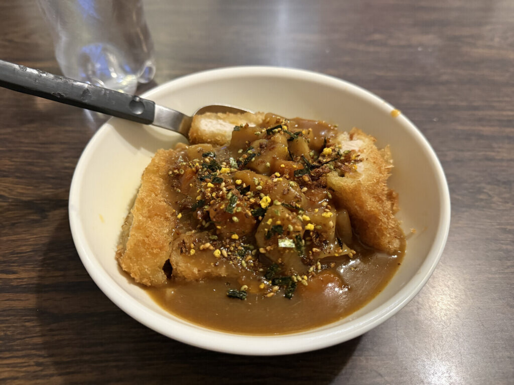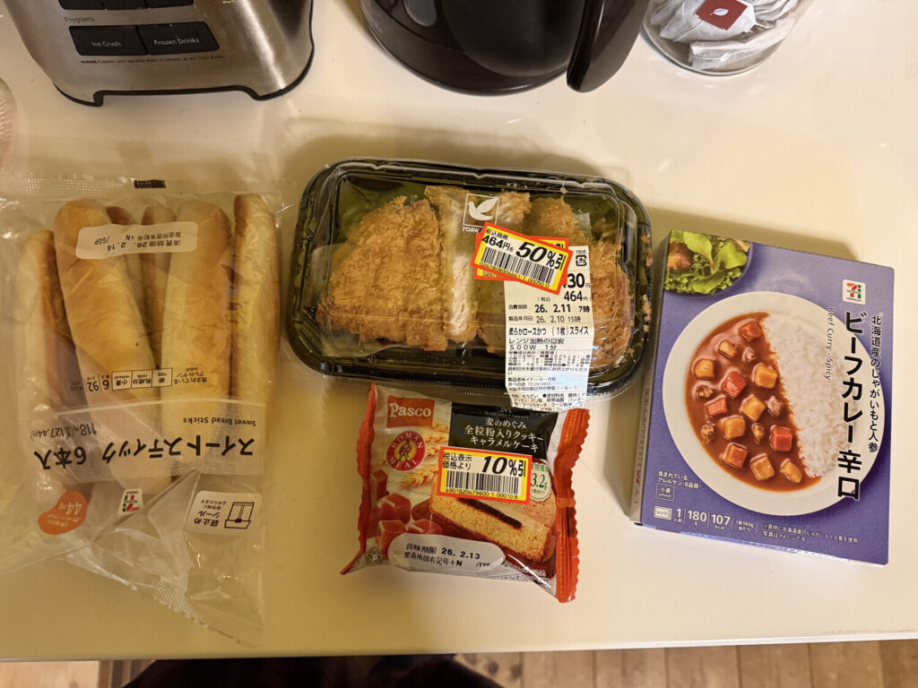 A las 21:00 fui a Ito-Yokado. El supermercado cerraba a las 22:00. Fui tarde a propósito para conseguir comida fresca con buenos descuentos. Creo que llegué un poco tarde porque ya la mayoría había sido vendido. Justo pude conseguir el último paquete de chuleta de cerdo al 50% (~200 yenes en lugar de 400), así que me llevé eso, un paquete de curry (del que se calienta en el microondas), algo de pan y un postre. Todo lo pagué ¥599 (~3,3€).