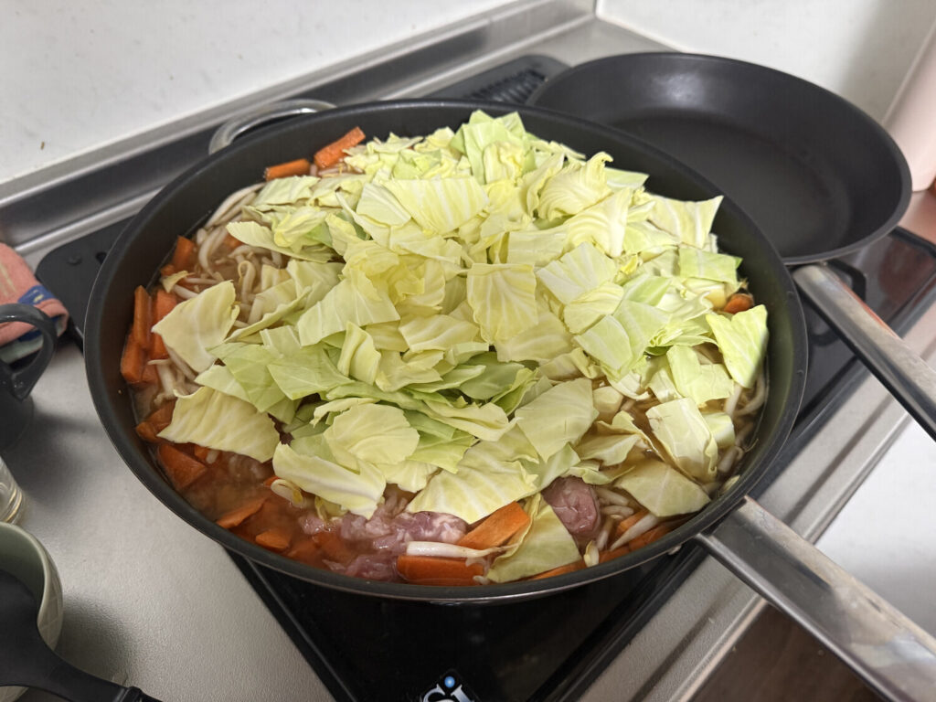 Me dijeron que vendrían diez niños y que cocinaríamos ramen para todos. En particular, 煮込みラーメン (nikomi rāmen; ramen guisado / preparado a fuego lento en una sartén). Era con base de miso y le añadimos varias cosas arriba como zanahoria, repollo, brotes de soja y carne de cerdo.