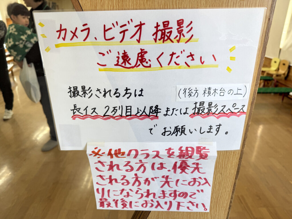| カメラ、ビデオ撮影 ご遠慮ください。撮影される方は長イス2列目以降または撮影スペース(後方 積木台の上)でお願いします。 | Por favor, absténganse de tomar fotografías o grabar vídeos. Quienes vayan a grabar, por favor hacerlo desde la segunda fila de bancos largos o en el espacio designado para grabación (en la parte de atrás, sobre la plataforma de bloques. |