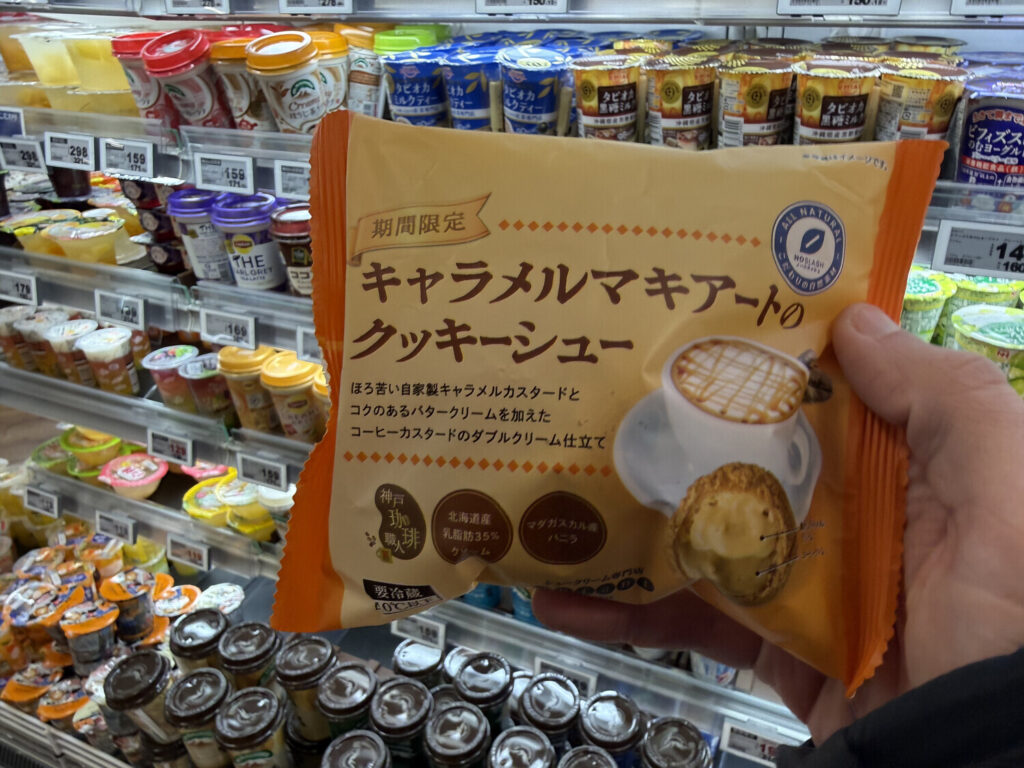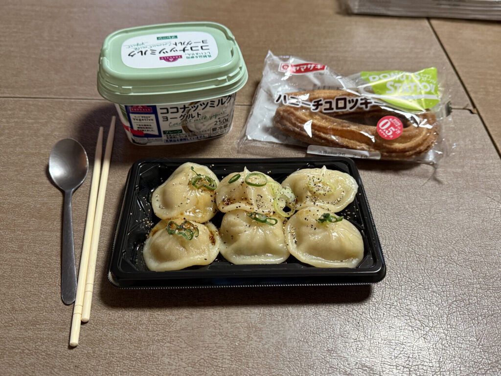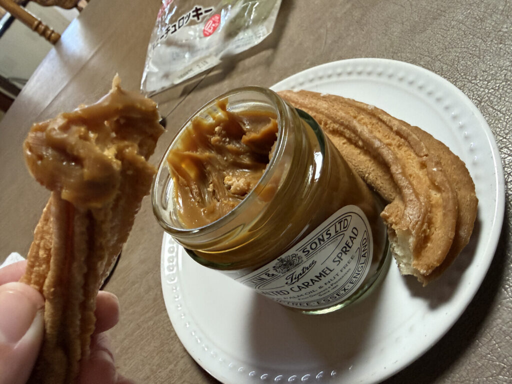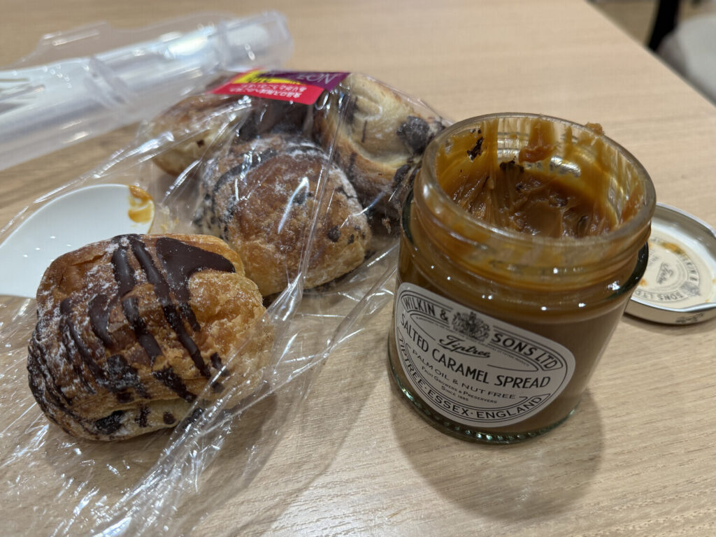 A las 18:30 me compré en la parte de panadería del supermercado Aeon en 1F, unos mini pains au chocolat (¥226; ~1€) y los comí con el untable de caramelo salado. Esa fue mi merienda.