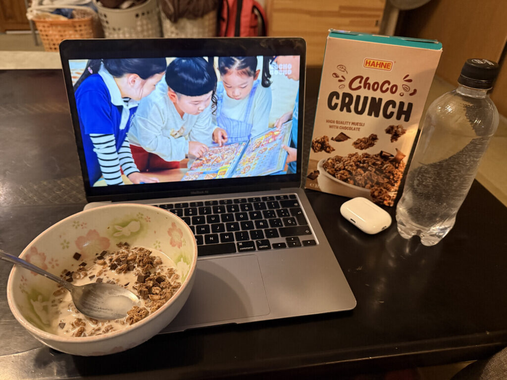 El sábado a las 9:00 me levanté y bajé a la sala común, donde desayuné muesli con leche y café con leche mientras veía algunos vídeos de mi canal favorito de YouTube, Cocho Cocho.