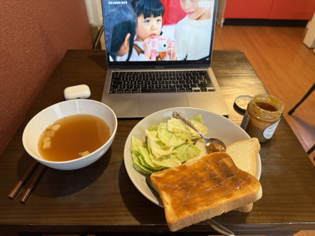 El desayuno del hotel era sencillo pero suficiente: dos panes, una ensalada de lechuga, una sopa y café. Lo tomé mientras veía Cocho Cocho, en particular un vídeo en el que los niños mostraban cosas que Papá Noel les había regalado.