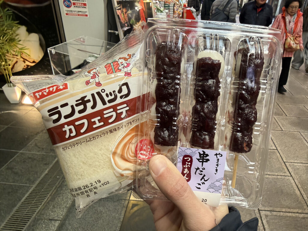 El viernes a eso de las 8:00 salí del hotel y me tomé un tren a Kioto. Una vez más tuve que salir rápido sin llegar a desayunar nada, así que en un momento cuando pasé por un supermercado Fresco entré y me compré una hamburguesa con queso y un sándwich de menchikatsu (¥289; 1,6€). Calenté ambos en el microondas y me los comí mientras caminaba por la calle.