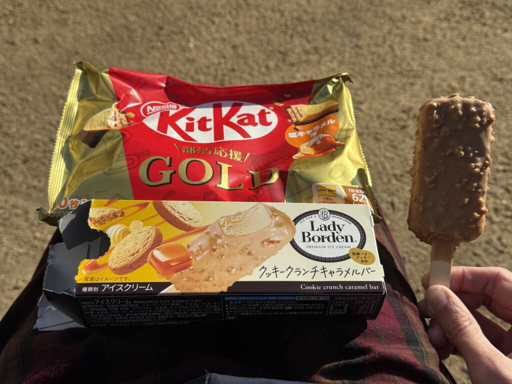 Me paseé un rato por los alrededores de la estación. En un momento pasé por un Lawson 100 y me compré un par de cosas más para comer, incluyendo un helado de caramelo ¥470 (~2,6€). Luego me senté en un parque me tomé el helado allí.