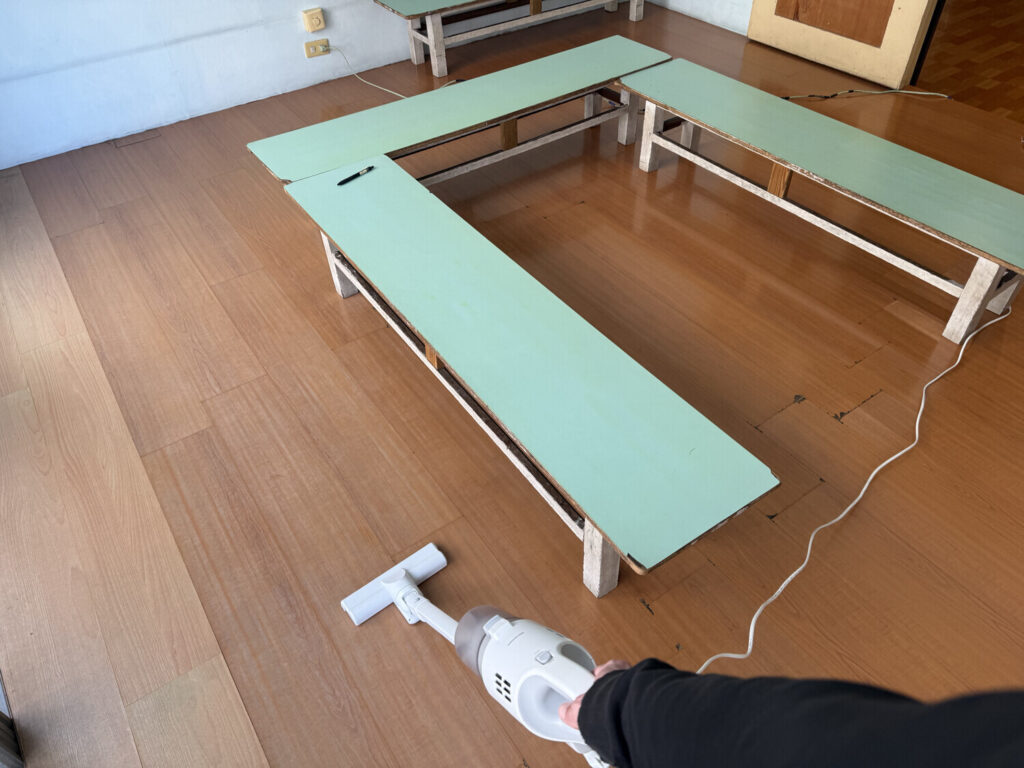 La indicación de Chen fue que básicamente hiciera lo que Xinyu me pidiera, y la indicación de Xinyu fue que la ayudara a limpiar el centro antes de que llegasen los niños. Me mostró donde estaban la aspiradora y la fregona y me enseñó a usarlos. Mientras yo limpiaba el piso tanto de la primera como de la segunda planta, ella se encargaba de limpiar los bancos y los baños.