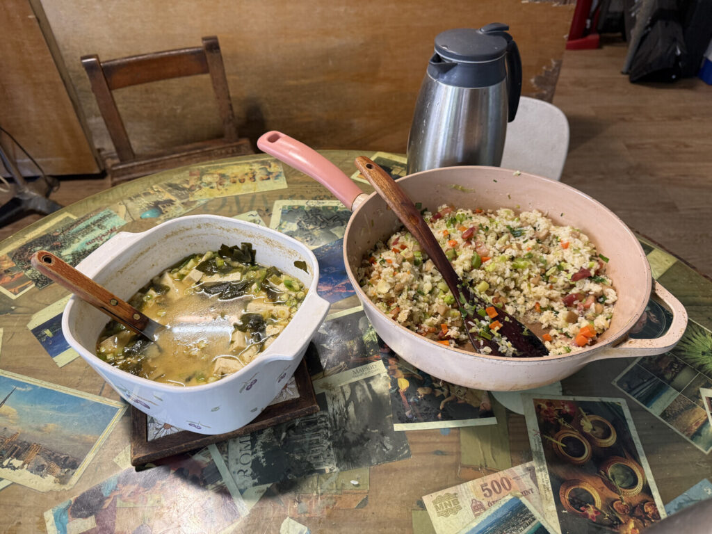 A las 12:00 pasadas terminé de limpiar y me llamaron desde abajo para avisarme que el almuerzo estaba listo. Xinyu nunca come en el centro, supongo que porque recibe un salario y prefiere cocinarse o comprarse lo suyo afuera. Así que éramos solo Chen, Wing y yo.