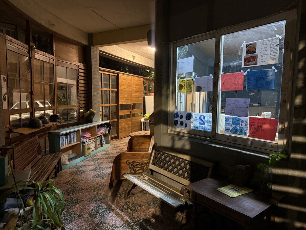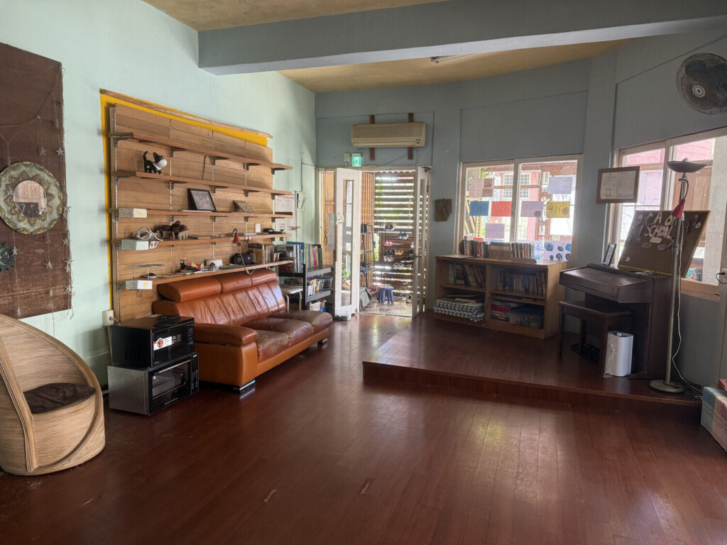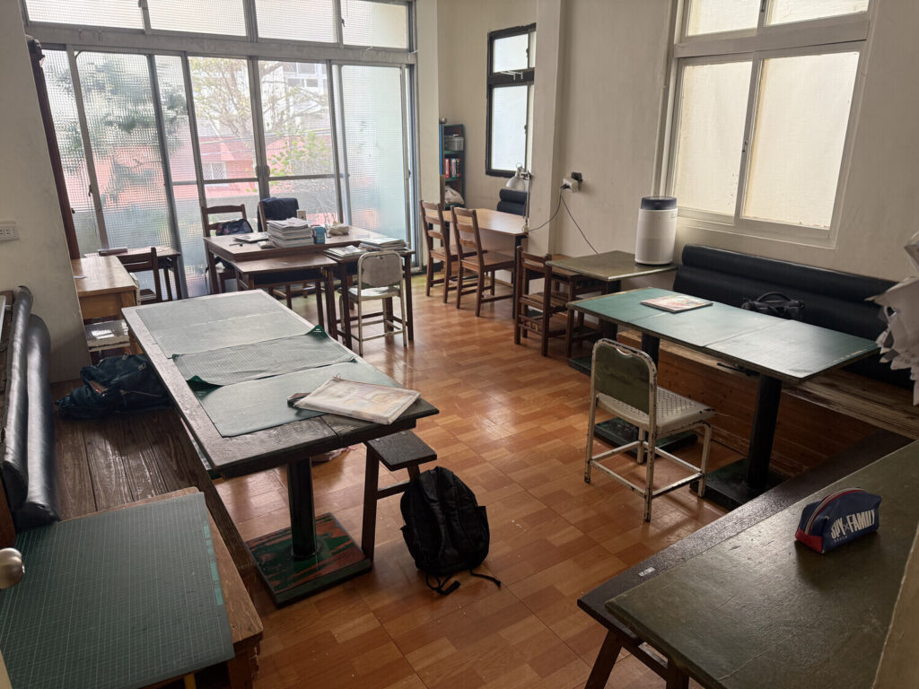 En el 2F había un total de cuatro espacios diferentes, que podría decirse que eran las aulas. Dos aulas tenían sillas y mesas, otra bancos largos y otra un televisor. También había una sala pequeña adicional con útiles de oficina como una impresora/fotocopiadora, teléfonos, taquillas, etc. Había un 3F también, pero no era más que un almacén/depósito. En el descanso de las escaleras rumbo al 3F había otro baño, y eso era todo. La casa estaba ubicada justo en una esquina.