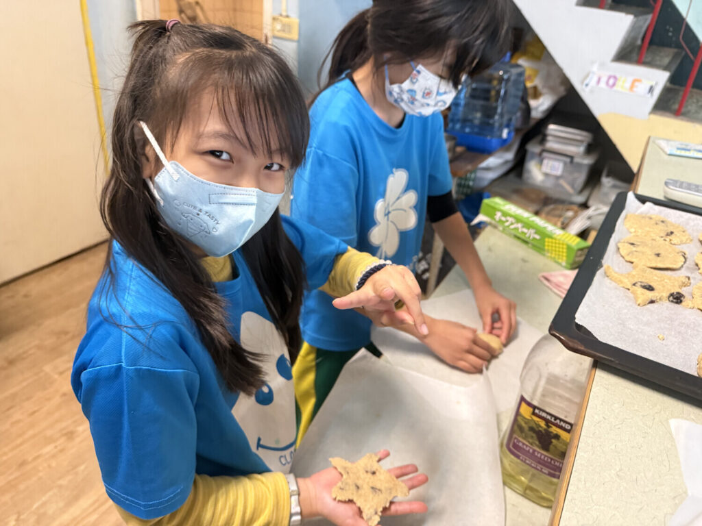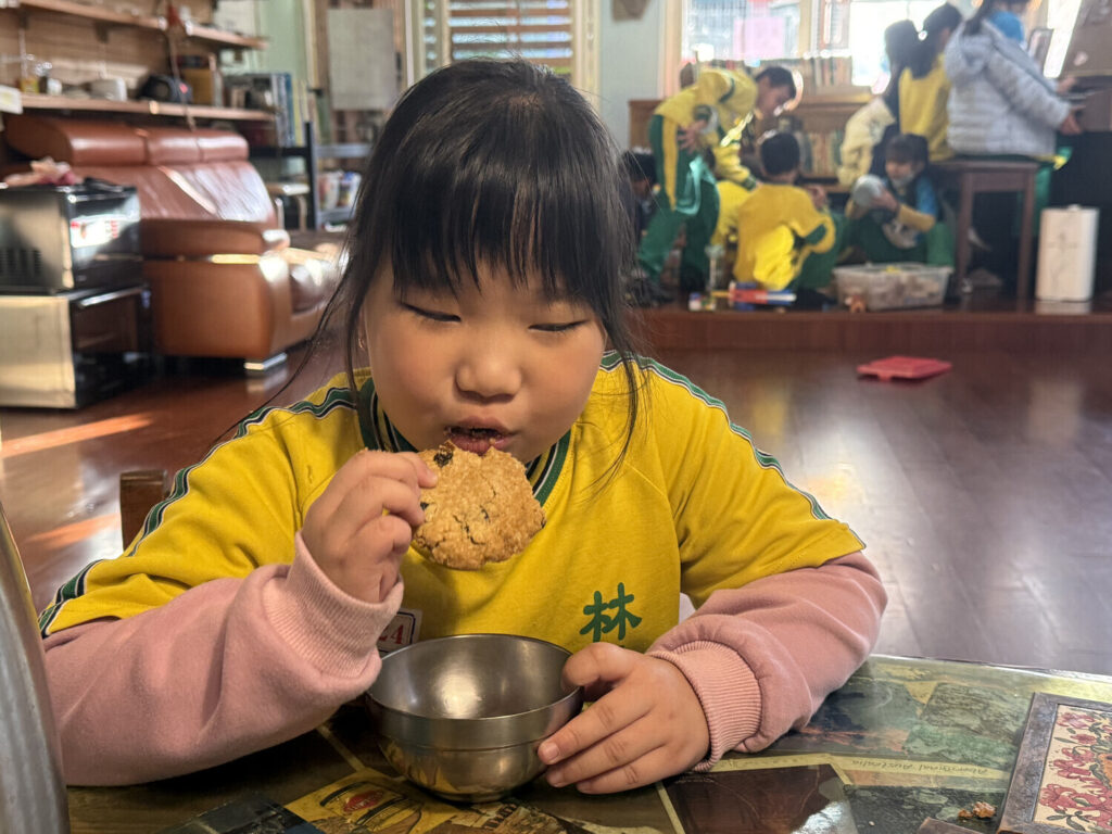 A las 15:00 volvimos al centro. Dos niñas ayudaron a hacer galletas para todos. Yo también las ayudé, según me indicó Xinyu: separé bolas de ~40 gramos de masa y se las fui pasando a las dos niñas para que ellas les dieran las formas que quisieran. Al principio hacían siempre los círculos tradicionales, pero después se aburrieron y empezaron a hacer formas originales como estrellas.