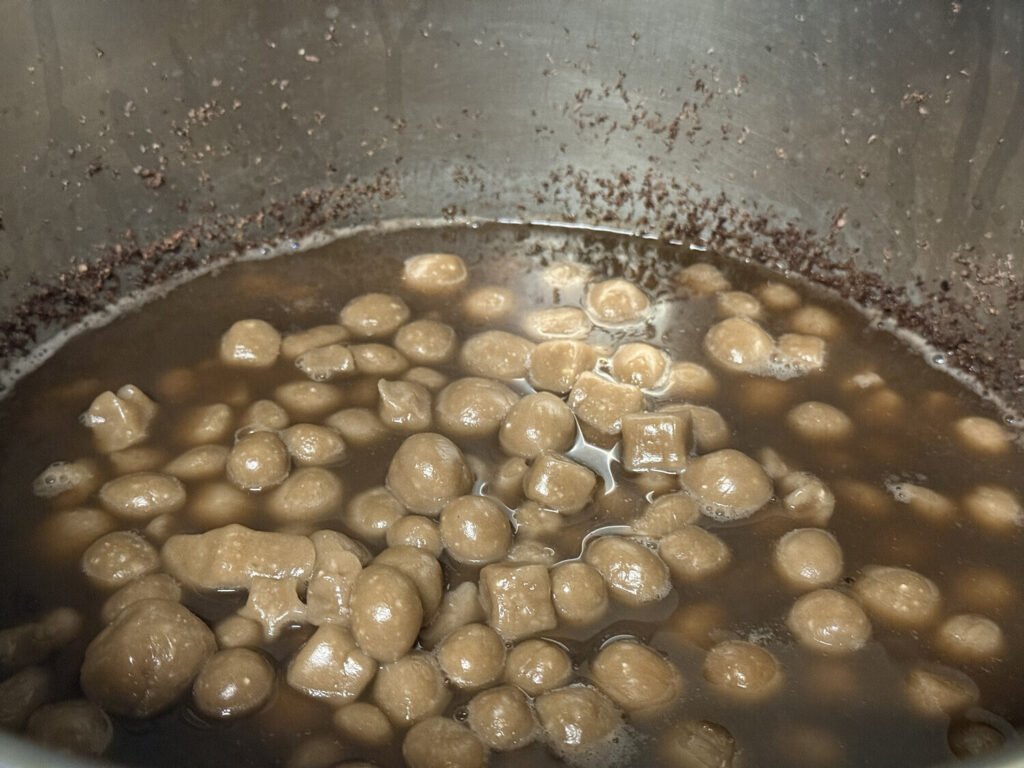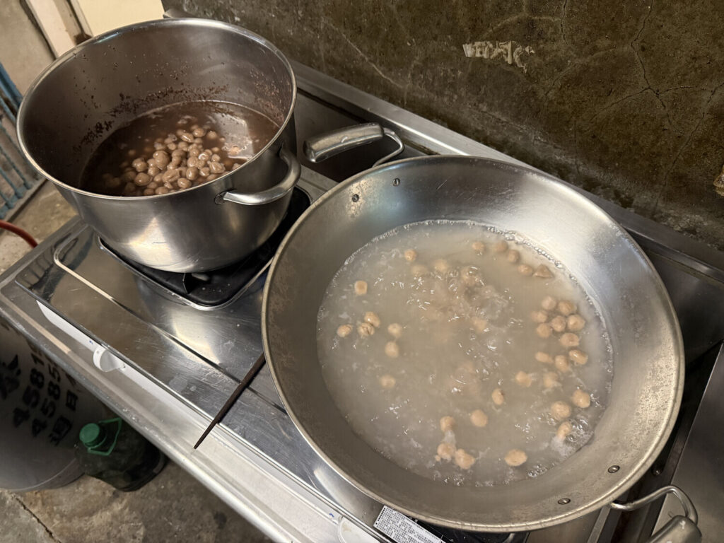 Luego de que los niños le diesen forma a las bolitas, bajo instrucciones de Xinyu, yo las puse todas en una olla y las herví hasta que empezaron a flotar, luego las pasé a la otra olla donde estaba la sopa de judías rojas.