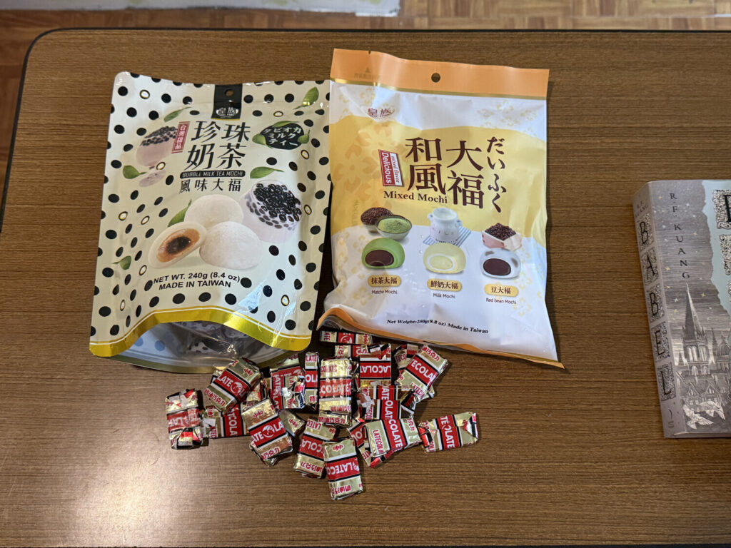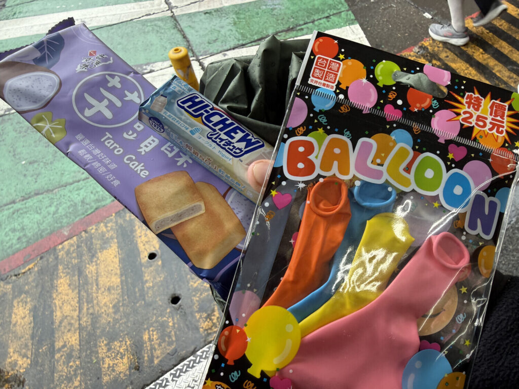 Los globos que compré, junto a otros snacks para mí (Taro cake y Hi-Chew de yogur).