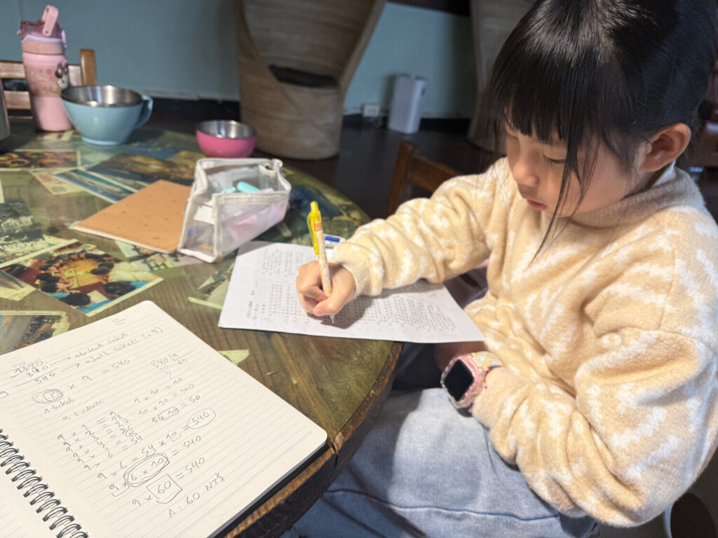 Para la tarea de matemáticas Peipei tenía que resolver problemas. Lo que hice para poder ayudarla fue usar mi teléfono para traducir los problemas, que estaban escritos en chino en el libro de la niña. Enseguida me di cuenta de que se trataban de problemas de división. Por ejemplo recuerdo que había uno que decía algo como: