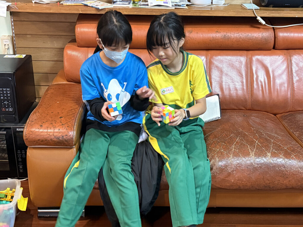Las dos mejores amigas Meilin y Yating, intentando resolver un cubo de Rubik.