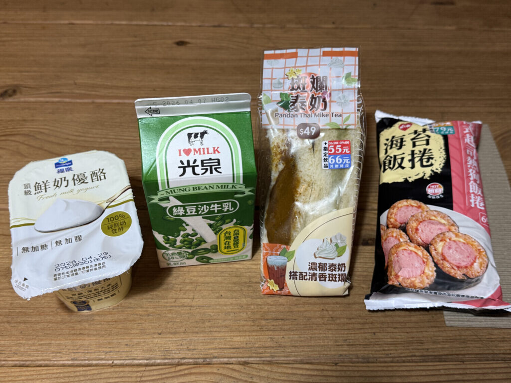 El sábado me levanté a las 8:30 y noté que afuera estaba lloviendo. Originalmente tenía planeado ir a un restorán de desayuno (早餐店; zǎo cān diàn) —local de comida que solo abre a la mañana y te vende cosas típicas de desayuno— pero quedaba a varias cuadras y con la lluvia prefería no moverme tanto. Así que terminé comprando mi desayuno en el Hi-Life de la esquina (NT$192; ~5€).