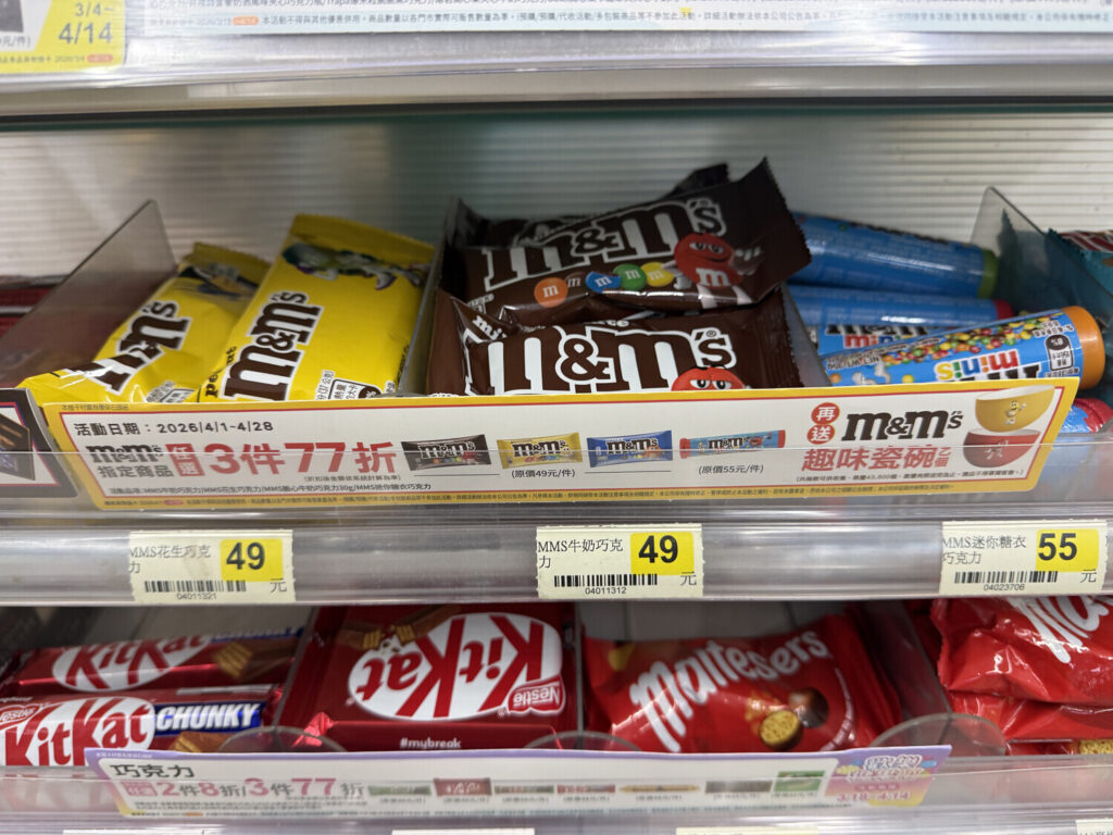 A las 10:00 dejé el hotel y caminé hasta la estación. En el trayecto pasé por un 7-Eleven y compré tres productos de M&M’s (NT$118; ~3€), tras lo cual recibí un bol gratis de premio.