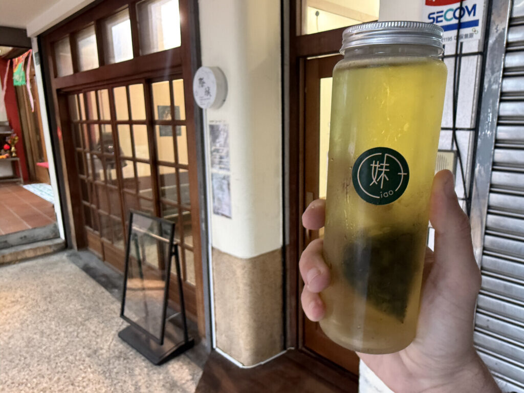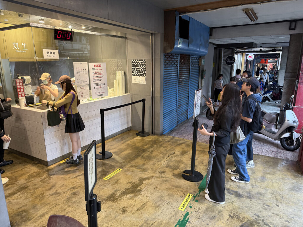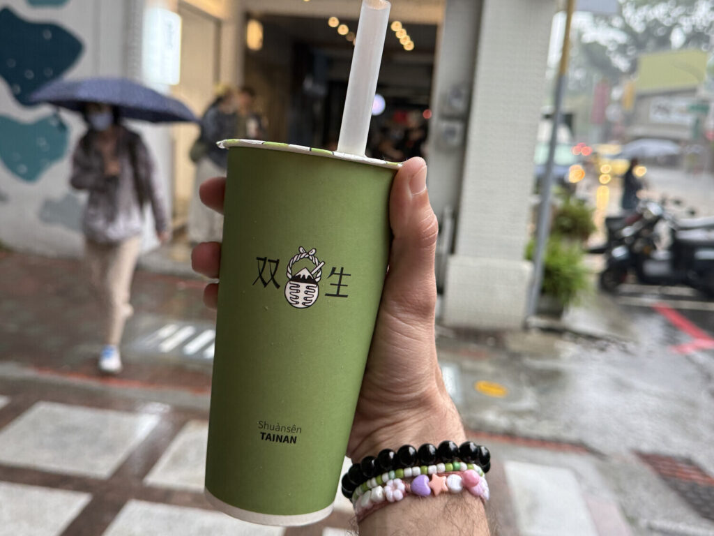 Cerca de las 15:00 me pedí un 綠豆沙 (smoothie de judías verdes) en 双生 (Shuànsên). Parece que el local era popular dado que había fila, pero por suerte avanzaba rápido. Solo tenían para llevar, con lo cual hacías tu pedido, lo pagabas, lo recibías y te ibas.