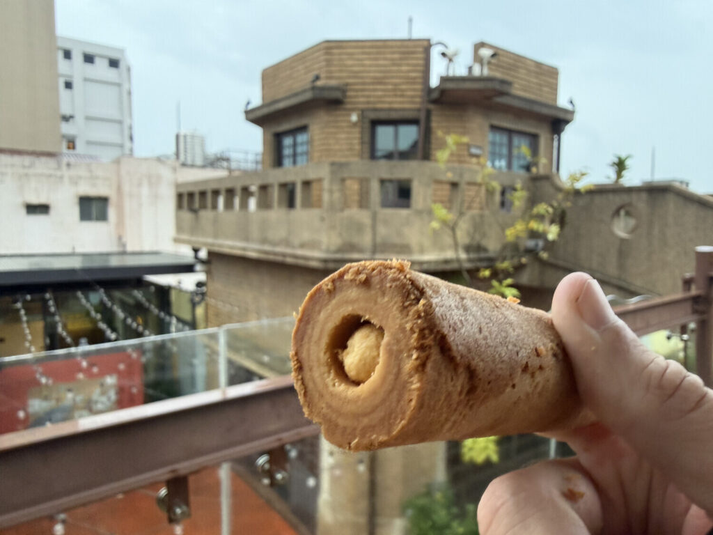 Estos barquillos, si bien son originarios de España, son bastante populares en Taiwán, y suelen tener rellenos de todo tipo. En este local vendían con relleno de chocolate, café, té, queso, sésamo y demás. Yo me compré uno de 鹹蛋黃 (xián dàn huáng; yema de huevo salada). Me costó NT$40 (1€).