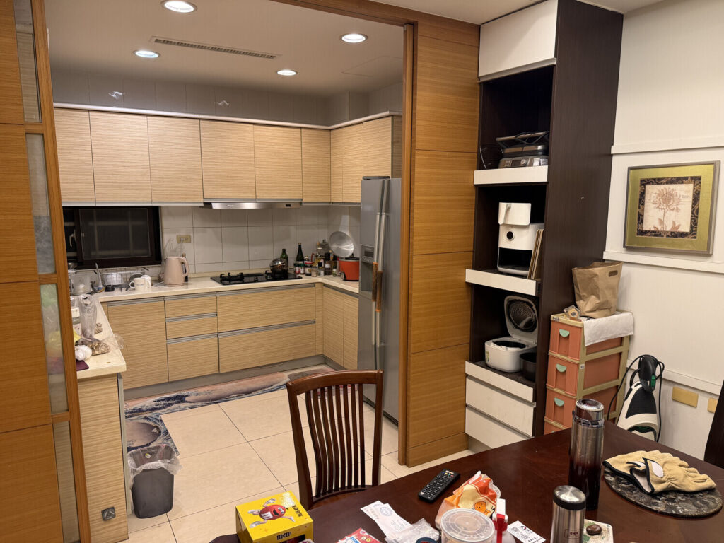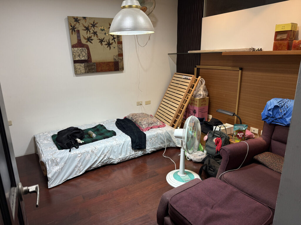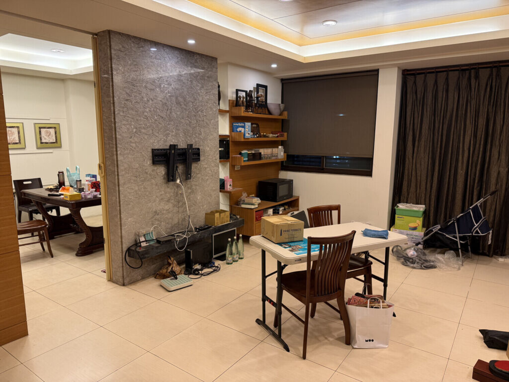 La casa era grande, con cinco plantas. En el 1F había una garaje y estaba mi habitación. En el 2F estaban el salón, la cocina y el comedor. En el 3F dormían Kuan-yu con su esposa e hija. En el 4F había un cuarto con una cama y un escritorio (en plan dormitorio/oficina) y un baño con ducha. En el 5F estaba la terraza, y era donde lavaban y secaban la ropa.