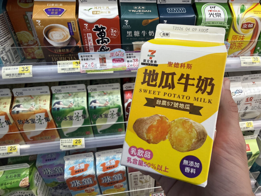 A las 15:00 me fui y caminé hacia el hotel, pero primero pasé por un 7-Eleven y me compré una 地瓜牛奶 (leche de batata). Es ridícula la variedad de leches y tés que tienen en Taiwán; me encanta.