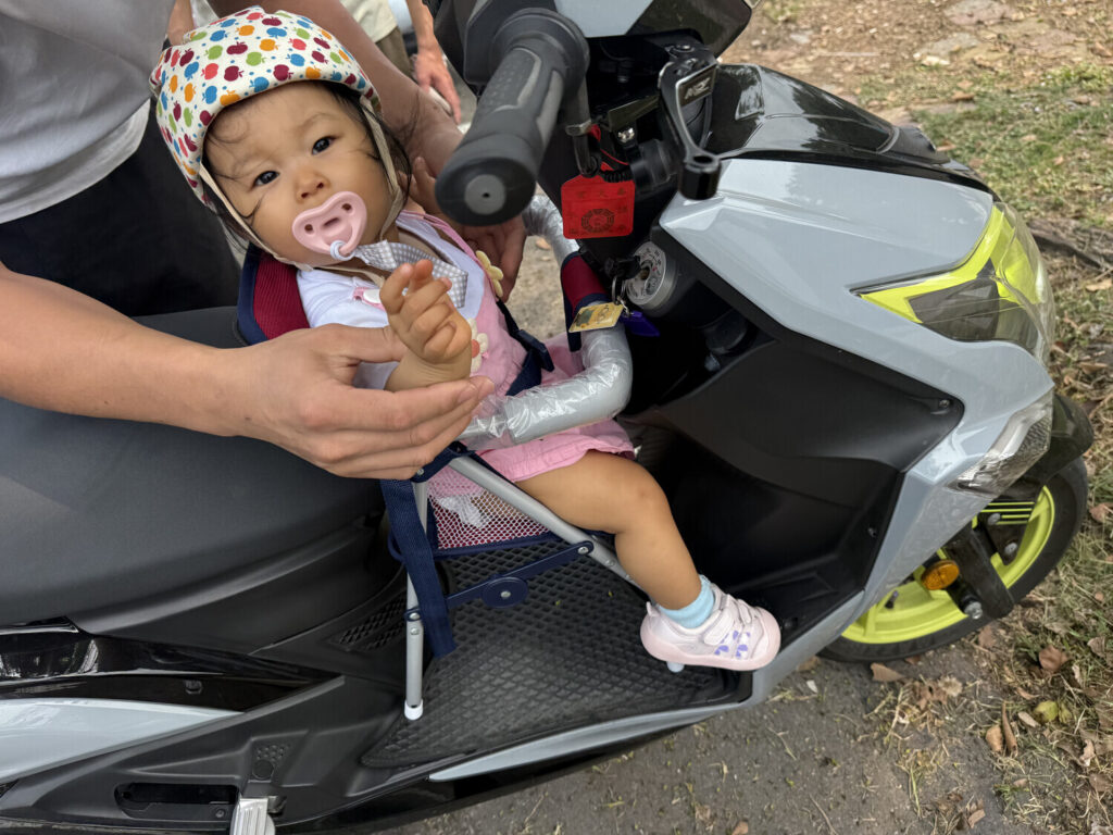 A las 11:00 me crucé con una familia compuesta por Papá, Mamá y Loli. Los vi justo cuando estaban montando a la loli de un año en una sillita para transportarla de forma segura en el escúter. Me acerqué y les pregunté a los padres si podía tomar una foto de su peque tierna.
