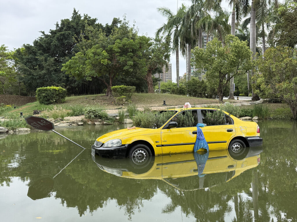 Take Sea juega con el sonido y las asociaciones de la palabra «taxi». Un taxi amarillo, emblema de la movilidad urbana y la eficiencia, se adentra directamente en el lago del museo y queda parcialmente sumergido. Sin embargo, la escena no transmite ninguna sensación de urgencia. Al contrario, rebosa una extraña calma, casi vacacional.