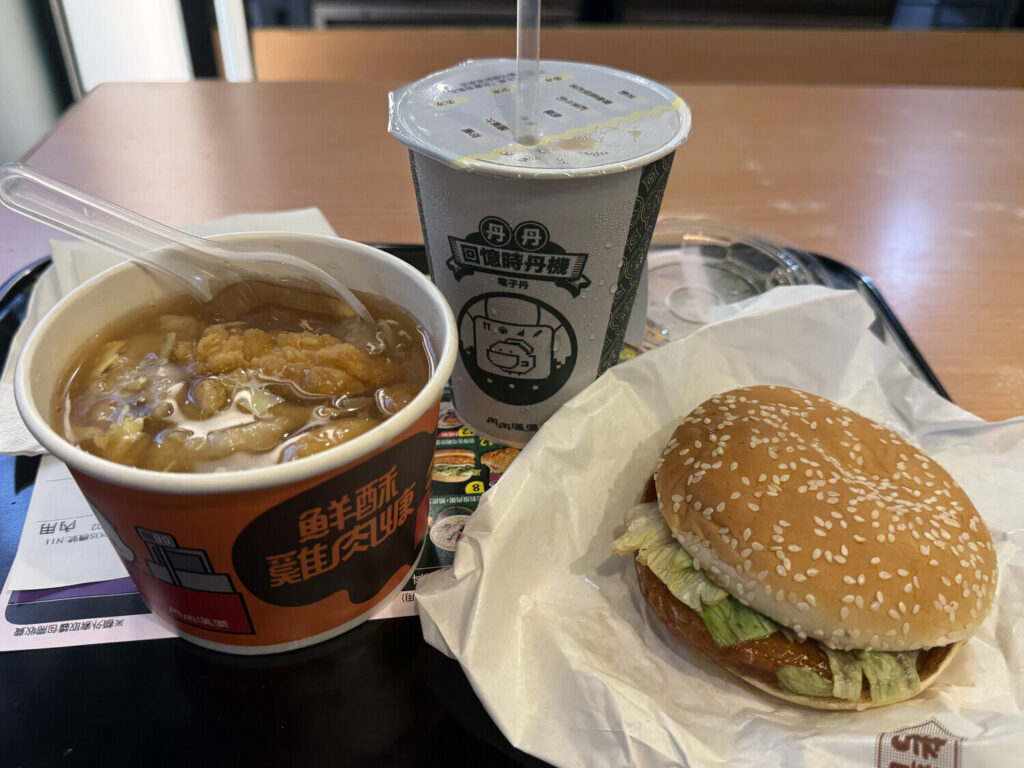 A las 17:00 llegué a 丹丹漢堡 (Dan-Dan Hamburger) y me pedí el menú 6: 鮮酥雞肉焿+烤醬雞堡 (sopa de pollo crujiente + hamburguesa de pollo a la parrilla). Me costó NT$99 (~2,7€).