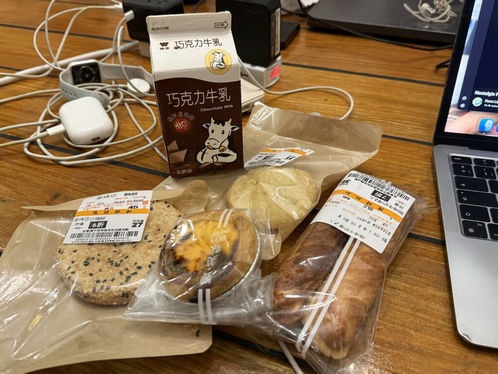 A las 18:00 pasé por un Carrefour y me aprovisioné de cosas (panes, galletas y chocolatadas) para esnaquear en el hotel, ya que como había cenado temprano sabía que volvería a tener hambre más tarde. Gasté NT$273 (~7€).