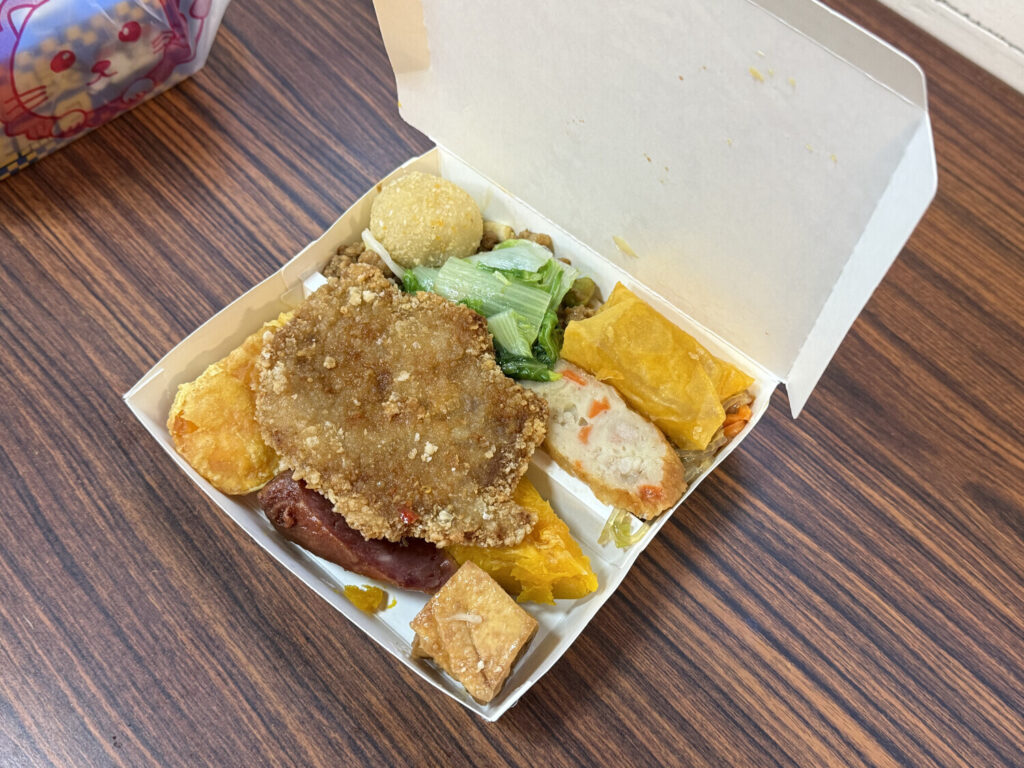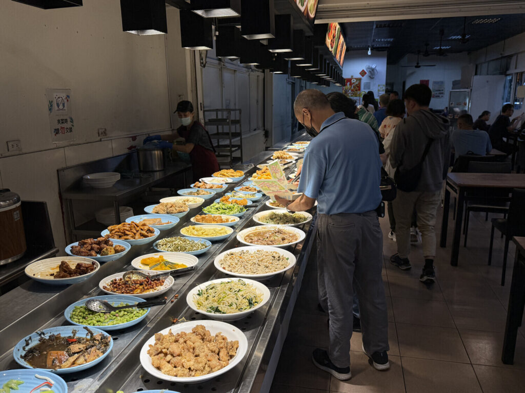 En Europa normalmente este tipo de lugares te cobran por peso o bien un precio fijo dependiendo del tamaño de la bandeja que uses. Aquí no—no sé exactamente cómo me cobraron pero sí vi que se fijaron bien cada una de las cosas que había agarrado. Me dijeron NT$140 (~3,8€), que no es ni muy caro ni muy barato para todo lo que agarré.