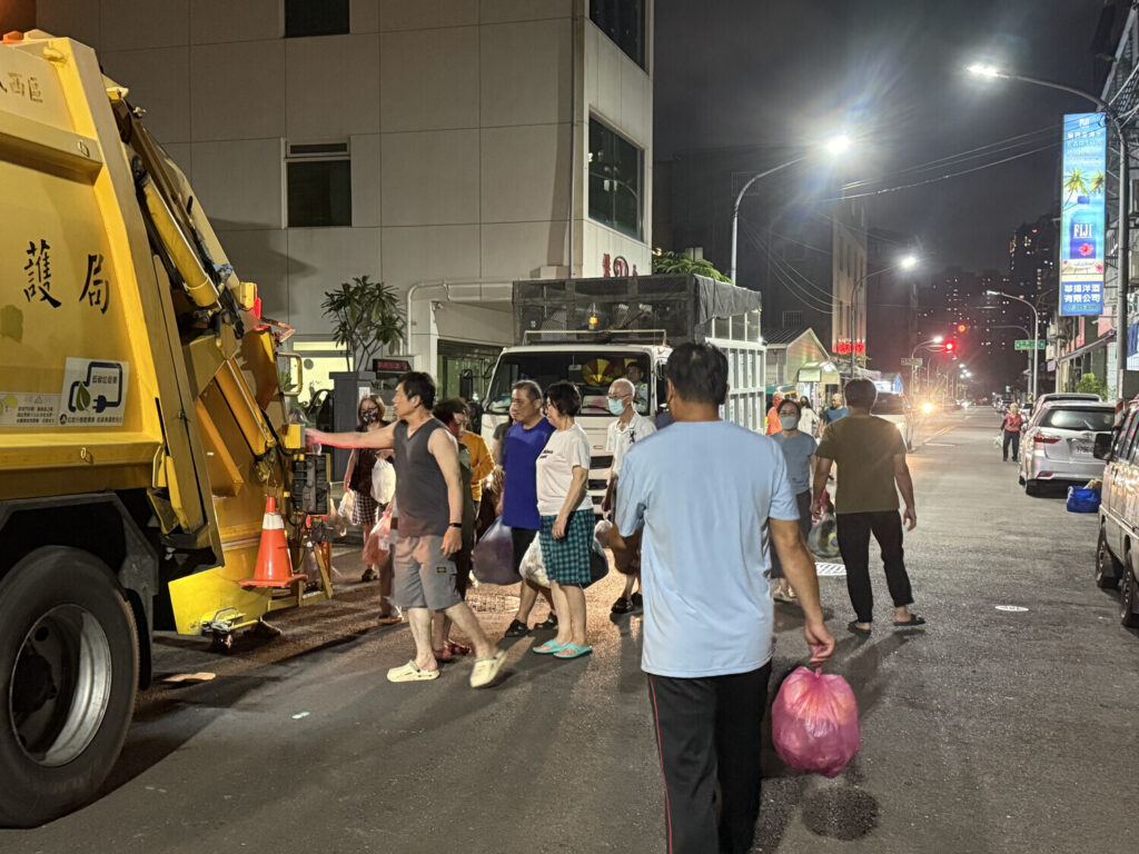 A las 19:15 me crucé con gente sacando la basura al estilo taiwanés: esperando en la calle todos juntos a que pase el camión, y luego acercándose al camión para darle las bolsas al basurero (o bien arrojarlas uno mismo dentro del camión).