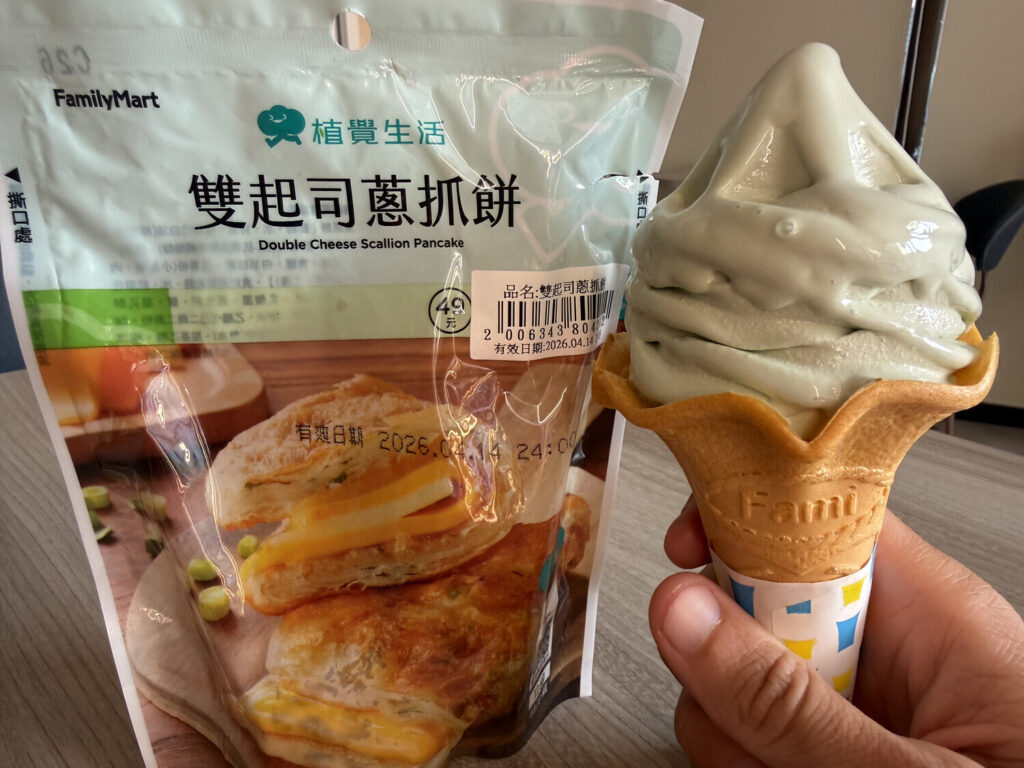 Un cono costaba NT$50 y dos —por una promoción que tenían—, NT$55, así que obviamente me pedí dos conos. También me compré una 雙起司蔥抓餅 (tortita de cebolla y dos quesos) por NT$49. En total pagué NT$104 (~2,8€).