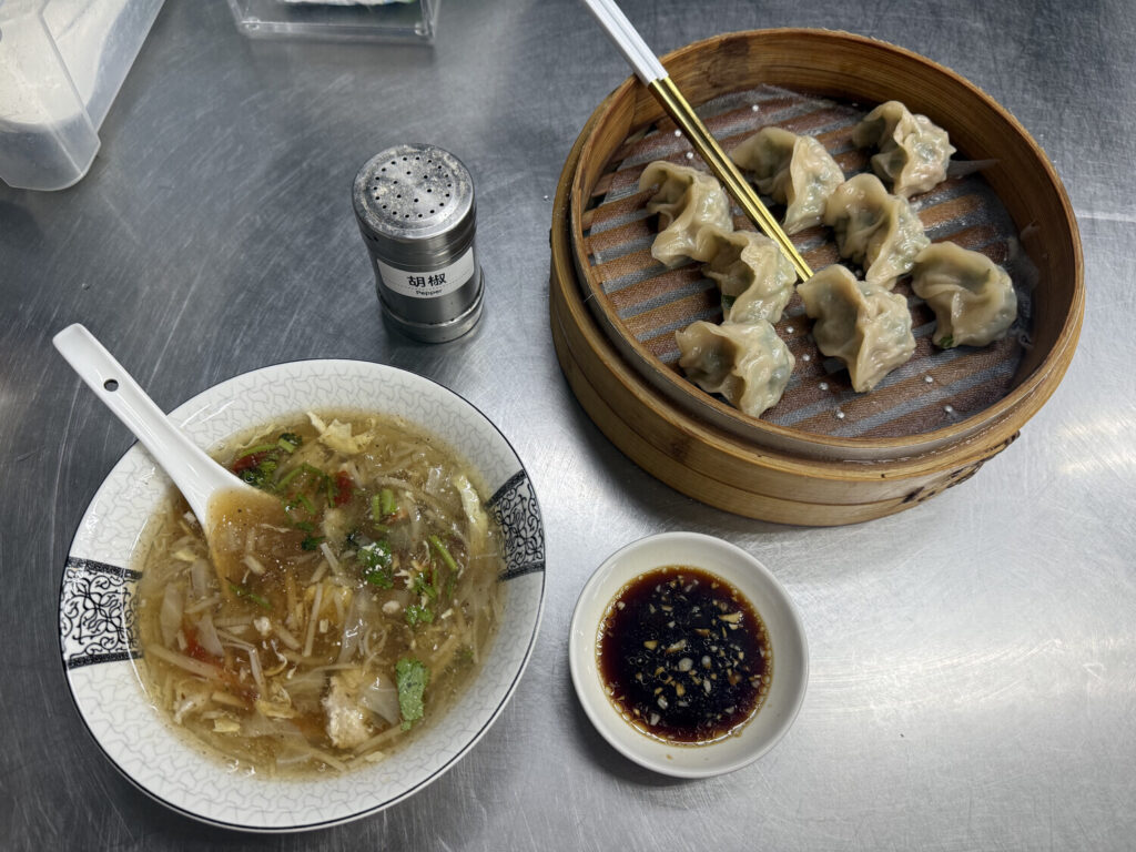 Me pedí una porción de 蒸餃 (zhēng jiǎo; empanadillas al vapor) y una de 肉焿 (ròu gēng; sopa espesa de carne). Me costó 80 + 60 = NT$140 (~3,8€).
