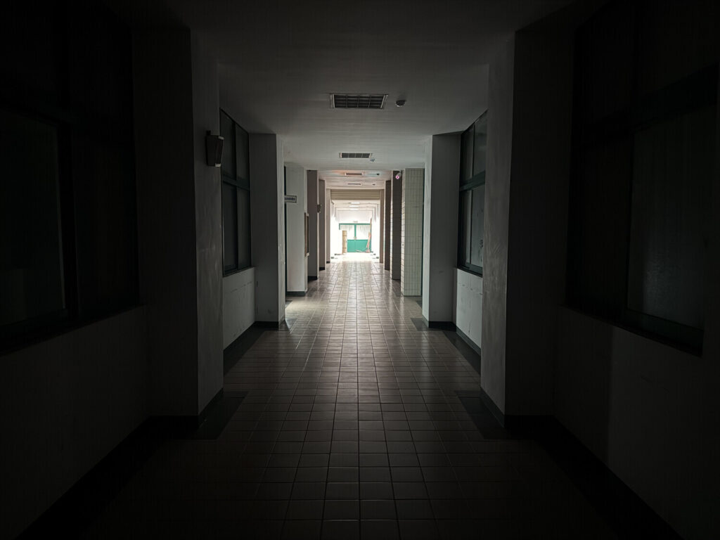 Había un montón de edificios, y todos parecían estar abiertos aunque bastante oscuros—solo con algunas luces encendidas. Las fotos que siguen a continuación fueron tomadas con el modo noche de mi teléfono, con lo cual imagínate que estaba más oscuro de lo que aparenta en las imágenes.